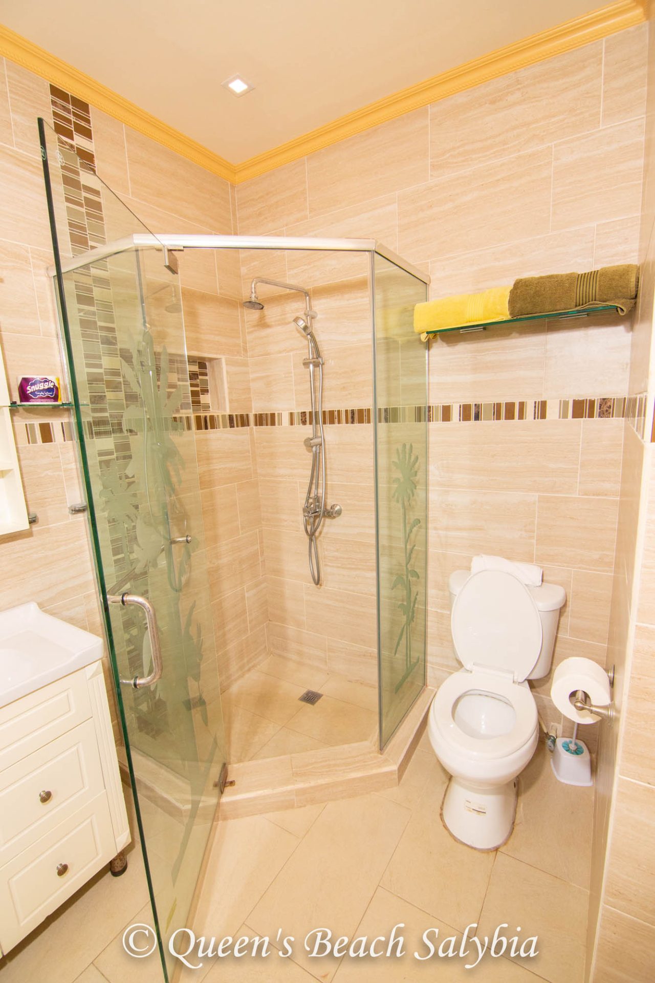 • Full-stall shower with variable-speed, hand-held flexible shower